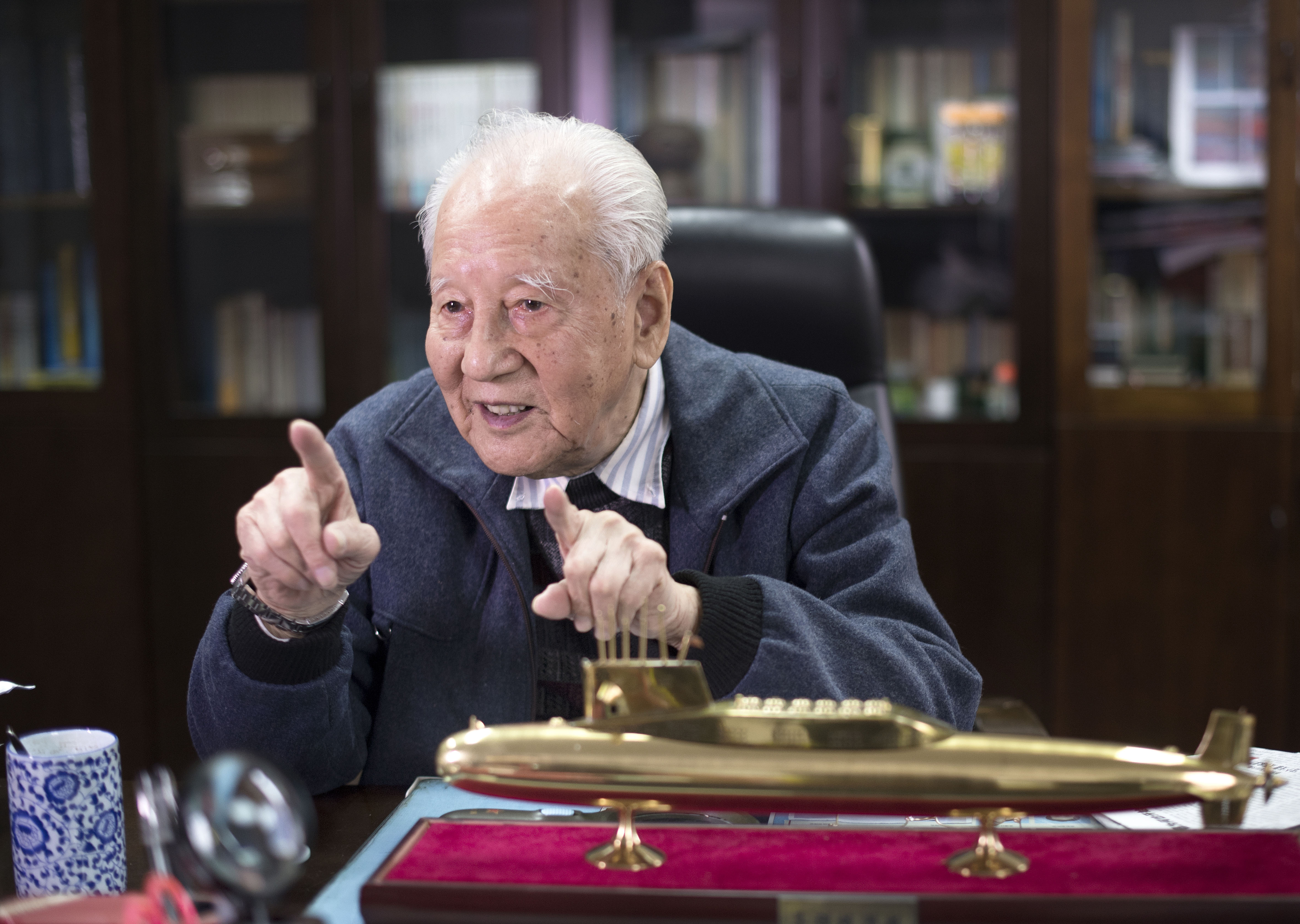2016年12月20日,黃旭華在辦公室內(nèi)與同事交談。新華社記者 熊琦 攝
